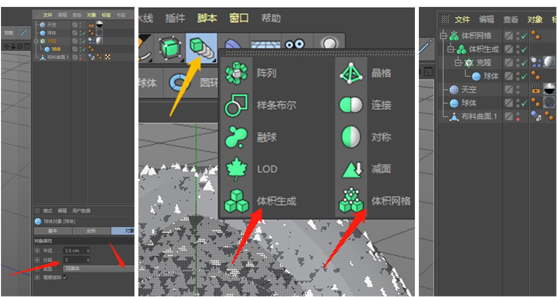 3.1 将克隆子集的球体类型改为四面体,分段数设置为3(最小值);在生成器一栏创建体积生成和体积网格,将克隆对象拖拽为体积生成的子集,体积生成为体积网格的子集。