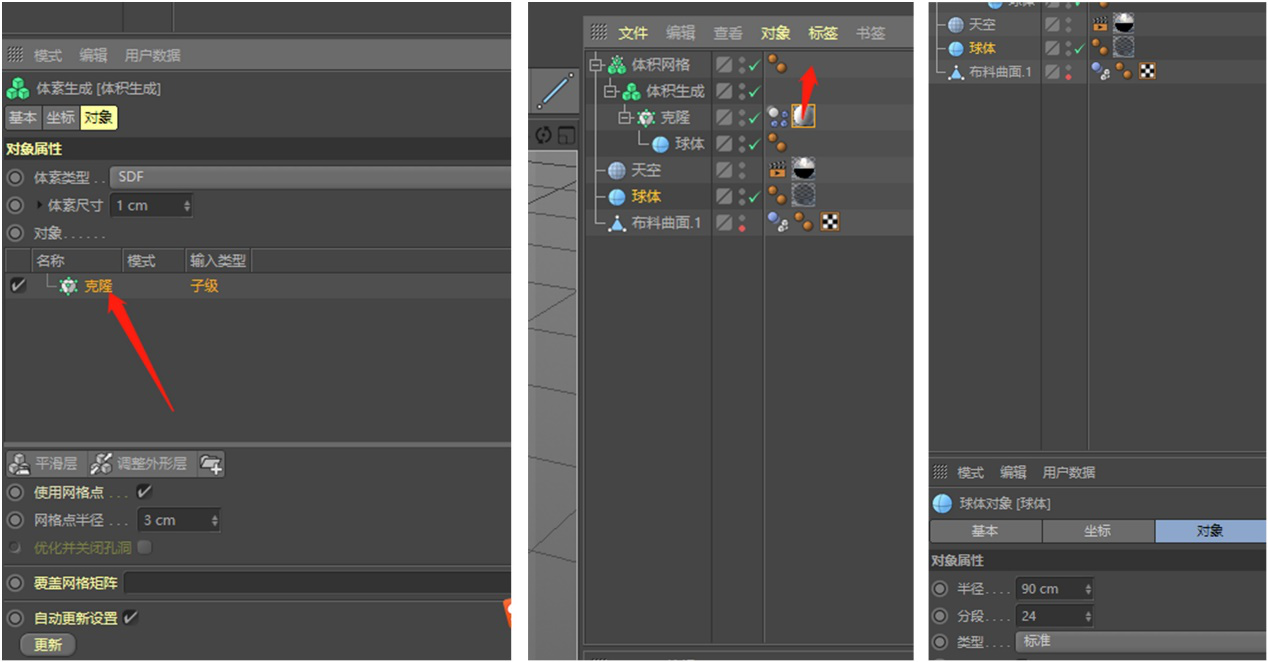 3.2 体积生成设置中,点击克隆勾选使用网格点,网格半径改为3 cm,体素尺寸改为1 cm;将克隆对象的材质拖拽给体积网格;将阴影球体的半径改为90~95 cm,防止阴影球体和堆叠球体重合。