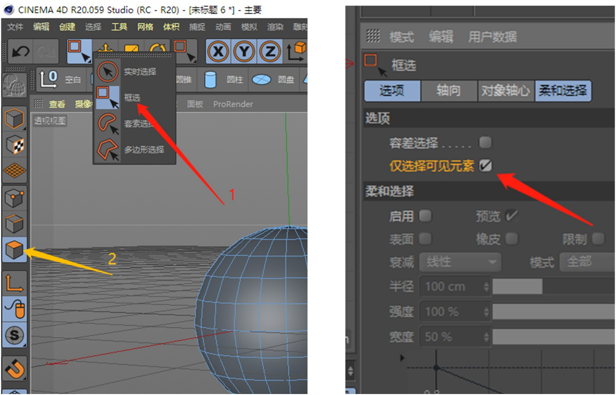 1.3 在选择工具选择框选模式,左侧选择面模式,框选设置中钩上仅选择可见元素