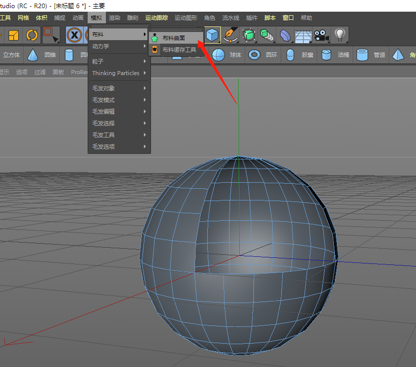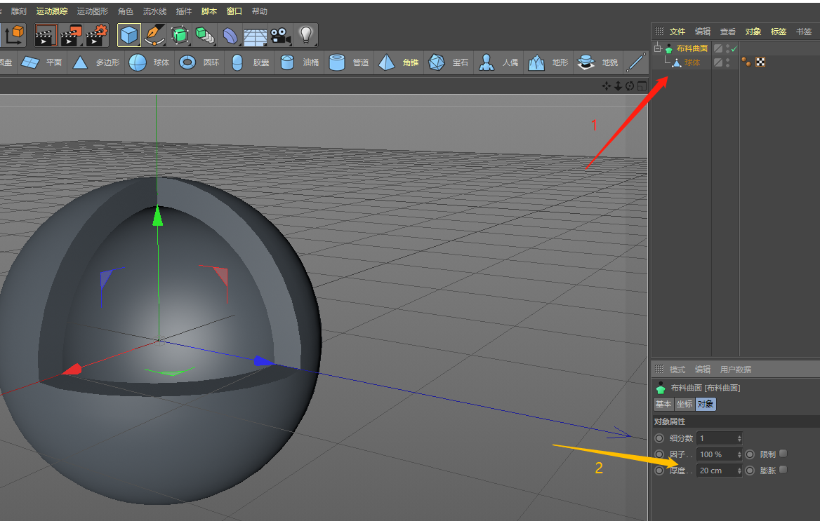 1.6 将删去部分面的球体拖入布料曲面子集,设置布料曲面厚度为20cm。