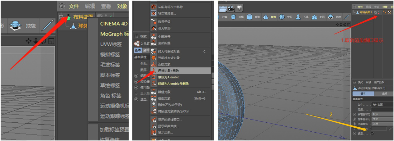 1.7 鼠标中键点击布料曲面,可同时选中布料曲面和球体,右键选择“连接对象+删除” ,将后方第二个圆点点为红色,取消对该多边形渲染,在基本属性中勾选透显。