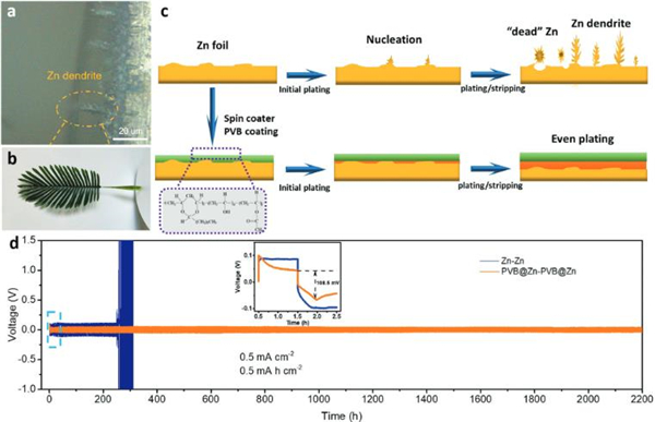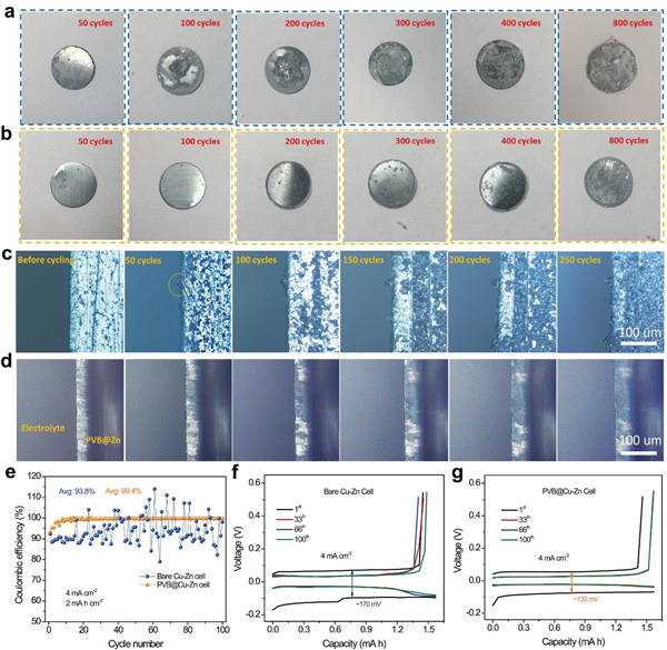 (c,d)不同镀覆/剥离循环次数下,对称透明电池中c)Zn电极和d)PVB@Zn电极表面的原位电镜对比;