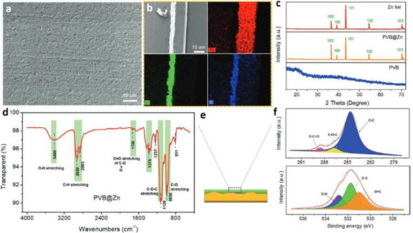 (b)PVB@Zn箔的横截面SEM及Zn、C和O元素的EDS图;
