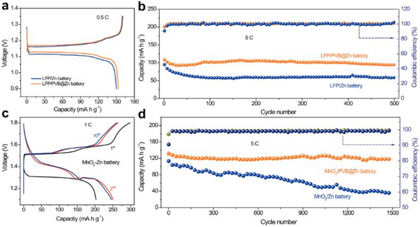 (a)在0.5 C,LFP/Zn和LFP/PVB@Zn电池的首次充放电曲线;