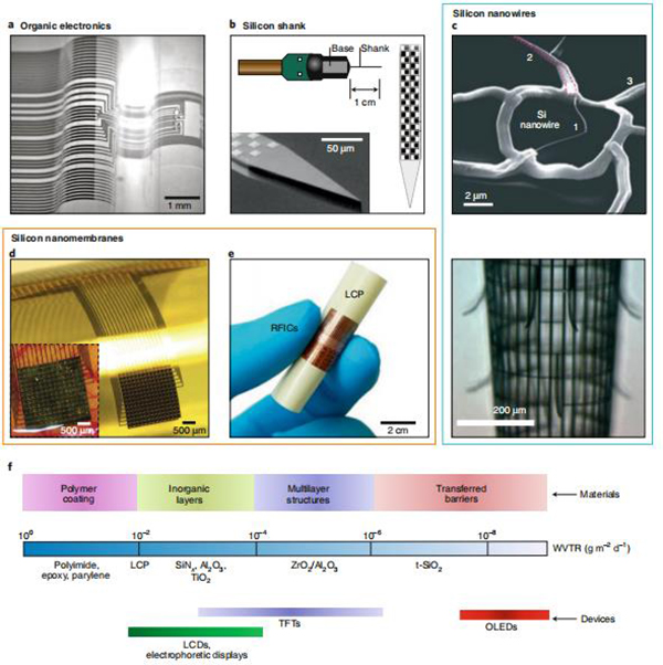 (h)基于聚酰亚胺衬底上一层单晶SiC的柔性生物集成电子,包裹在弯曲表面。