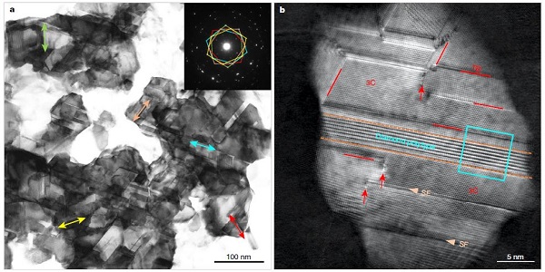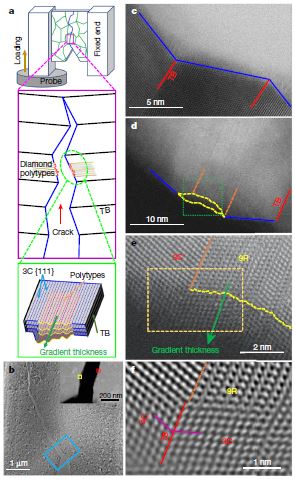 燕山大学的周向锋、田永君以及北航的郭林(共同通讯作者)联合团队在Nature发文研究表征了金刚石复合材料。这种复合材料由金刚石多型(polytypes)、交织的纳米孪晶以及连锁的纳米晶粒分级组装而成。研究表明,相比于纳米构造策略,这一分级结构能够在不牺牲材料硬度的同时显著增强复合材料的韧性——增强的韧性更是超越镁合金达到人造金刚石的五倍之多。机理研究发现,当断裂产生时,裂缝通过3C(cubic)多型中纳米孪晶进行Z型扩散;当裂痕遇到非3C多型区域时,则会促使断裂表面附局部地转变成3C金刚石。以上两种裂痕扩散过程都会驱散减弱应变能,从而增强材料韧性。因此,文章认为这一发现能够在超硬材料以及工程陶瓷领域有所应用。2020年06月17日,相关成果以题为“Hierarchically structured diamond composite with exceptional toughness”的文章在线发表在Nature上。
