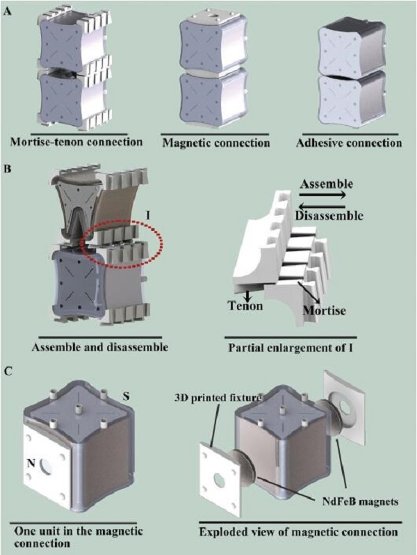 (A)三个连接方:mortise-tenon连接、磁性连接和粘合连接。