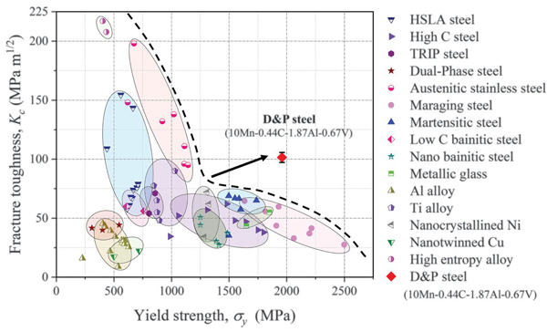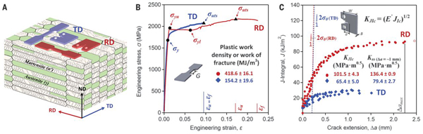 为满足经济可持续发展的要求,工程应用中不断追求轻质、经济、性能优良的结构材料。然而,获得高强度通常是以破坏韧性为代价的,这对于安全性至关重要的应用而言始终是主要关注点。结构金属和合金的强化机制是建立在通过引入不同长度尺度的各种障碍物来抑制或阻止位错滑移的基本原理上的。但是,大量的位错纠缠在微小的缺陷中,会产生局部的应力集中,从而导致裂纹萌生,最终导致严重的失效。克服强度-韧性权衡的主流努力集中在定制微观结构或通过固溶合金化设计材料上。由于变形诱导的纳米孪晶机制,多元素高、中熵合金在低温下具有特殊的损伤容限。马氏体时效钢是另一个例子,它被认为是航空航天应用中最强的金属合金,具有可接受的损伤容限。然而,马氏体时效钢含有大量昂贵的合金元素,如镍(17-19 wt %)、钴(8-12 wt %)和钼(3-5 wt %)。尽管马氏体时效钢的合金化策略是获得优异机械性能的理想工具,但由于成本和环境方面的考虑,无法进行经济的批量生产和回收。降低平均晶粒尺寸是提高强韧性组合的另一种非合金化途径。然而,这种方法可能是有限的,因为强化通常是以失去延展性为代价实现的。