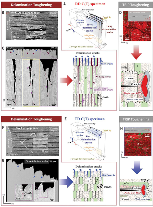 今日,在香港大学黄明欣教授和美国劳伦斯伯克利国家实验室Robert O. Ritchie教授(共同通讯作者)团队等人带领下,超强钢可以实现特殊的损伤容限,并采用简单的成分和具有成本效益的加工路线进行制造。研究表明,提高屈服强度并不会对韧性产生不利影响,相反,它可以促进分层增韧机制的激活,从而大大提高了韧性。具体来说,超高屈服强度使得能够在垂直于主断裂表面的界面处形成第二断裂模式,即分层裂纹。由于分层的发生,在断裂面附近发展出多条分离的层状韧带,为断裂提供了额外的能量释放速率,同时也增强了裂纹尖钝化,共同提高了整体的断裂韧性。这种分层增韧与变形诱导塑性(TRIP)增韧相结合的增韧过程很少在结构材料中同时实现。这种组合使钢材具有了强度、延展性和韧性的奇妙组合。相关成果以题为“Making ultrastrong steel tough by grain-boundary delamination”发表在了Science。