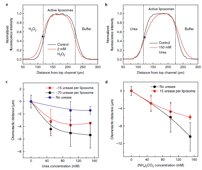 尿素酶是一种对尿素具有正向趋化性的生物酶。但是当研究人员将尿素酶装载到脂质体上形成尿素酶-脂质体纳米机器后,惊讶地发现这一纳米机器对尿素具有负向趋化性(图4b)。为了进一步验证这一现象,研究人员观察了不具活性的脂质体(未装载尿素酶)分别和尿素以及尿素水解产物(铵根离子和碳酸根离子)的作用,发现脂质体对尿素基质液不会产生额外的运动(除菲克扩散运动外)(图2c),而正如图2c和d所示,不具活性的脂质体和装载了尿素酶的脂质体却都对产物溶液产生了负向趋化运动。这就表明尿素酶催化尿素水解的产物才是脂质体负向趋化运动的真正原因。