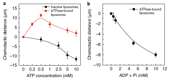 ATP酶可以将ATP转化成ADP和磷酸根离子(Pi),因此当键连有ATP酶的脂质体通过两端含有ATP基质液的通道时,脂质体能够展现出正向趋化性,并且在ATP浓度达到0.5mM时,正向趋化距离达到最大的11.4微米;然而,继续增加ATP浓度却会减少正向趋化距离——文章认为这是产物聚集抑制材料运动的结果(图5a)。然而,当键连有ATP酶的脂质体进入两端是ADP/Pi基质液时,由于排斥作用的存在,ATP酶的脂质体呈现负向趋化效应(图5b)。研究认为,由于ATP酶能够分解ATP形成具有排斥作用的产物ADP和Pi,因此在ATP基质液通道中,酶解驱动力和产物排斥作用同时存在并呈现竞争关系,致使TP酶-脂质体纳米机器在正向趋化运动后又呈现负向趋化运动。