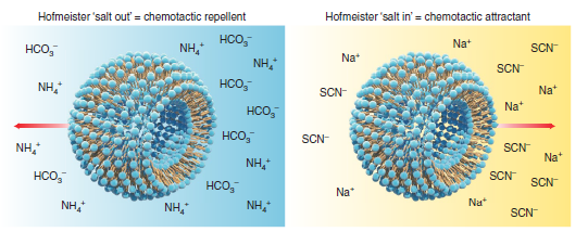 因此,文章提出了一种基于霍梅法斯特感胶离子序列(Hofmeister series)的新机理解释。在霍梅法斯特感胶离子序列中的离子能够改性蛋白质在特定溶液中的溶解能力。例如铵根离子和碳酸氢根离子能够提高蛋白质的表面能从而降低蛋白质的溶解能力(盐析);而氰根离子等可以降低蛋白质的表面能并增加其溶解能力(盐溶)。将这种效应用来解释纳米机器的运动,研究人员发现,感胶离子同样能够对脂质体表面产生盐析盐溶作用。当酶解产物为盐析离子时,酶解反应产生驱动力致使纳米机器远离;而当酶解产生盐溶离子时,则会对纳米机器起到吸引作用(图6)。在这一机理的指导下,研究人员通过控制产物离子种类可以控制纳米机器的正/负向趋化运动,最大的运动距离可以达到100纳米。
