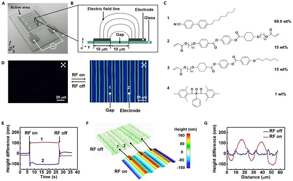 (D)在交叉偏振器之间拍摄的光学显微图像显示了初始垂直排列的介电液体1和当RF AC场打开时液体的重新排列;