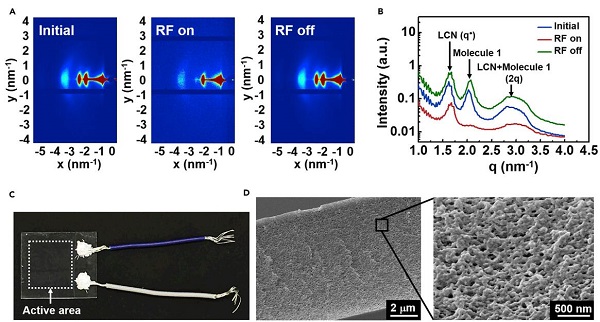 (D)偏光光学显微图像显示了初始涂层和受到RF AC场时的涂层。