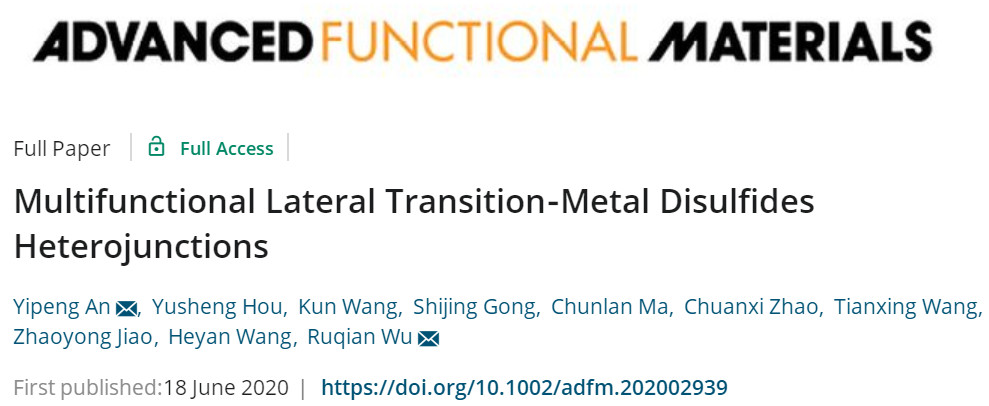 近日,河南师范大学安义鹏副教授课题组与美国加州大学Irvine分校Ruqian Wu教授等课题组合作,在国际顶尖期刊《Advanced Functional Materials》(IF=15.621)上发表了题为“Multifunctional Lateral Transition-Metal Disulfides Heterojunctions”的研究论文 (Full paper)。