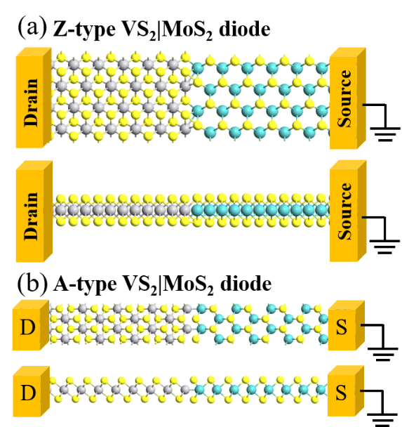 图1. a) Z-type和 b) A-type VS2|MoS2 侧面异质结二极管俯视和侧视图示意图。