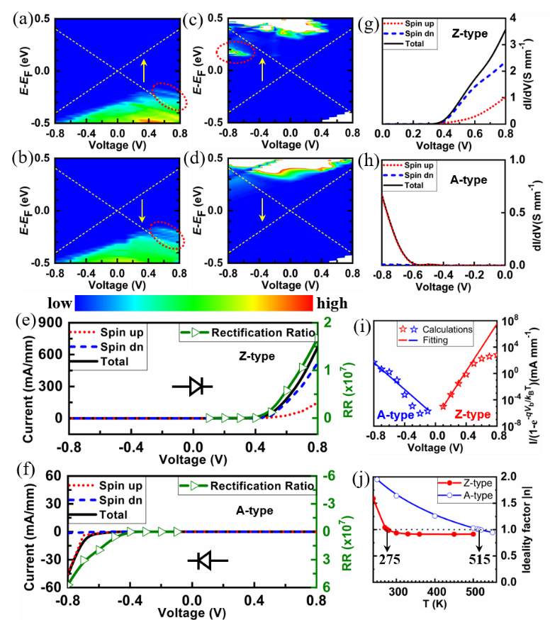 图2. Z-type VS2|MoS2 侧面异质结二极管的a)自旋向上和b)自旋向下电子传输谱,和 A-type VS2|MoS2 侧面异质结二极管的c)自旋向上和d)自旋向下电子传输谱。自旋相关I-V曲线,整流比率,dI/dV曲线。i) I/(1 − e−qVb/kBT)-Vb曲线,j)温度相关的理想因子|n|曲线。