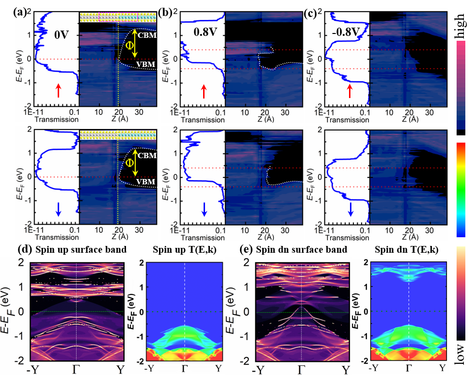 图3. 偏压相关的Z-type VS2|MoS2 侧面异质结二极管电子透射谱和局域器件态密度曲线a) 0伏,b)0.8 伏,c)-0.8伏。d)自旋向上的表面能带和T(E,K), e)自旋向下的表面能带和T(E,K)。