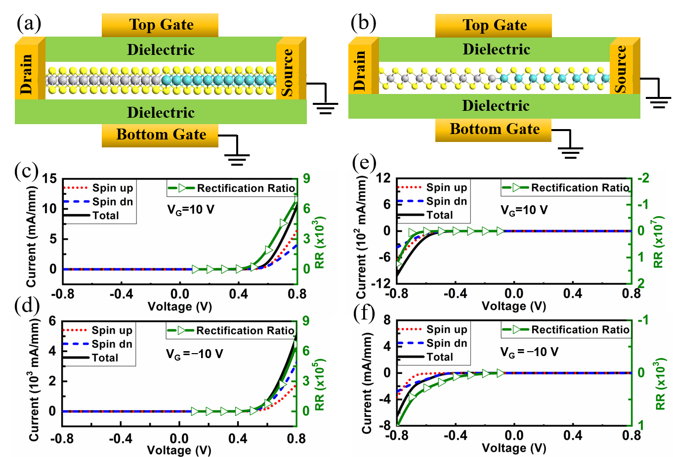 该论文对过渡金属硫化物1T-VS2|1H-MoS2侧面异质结的本征自旋输运性质和机理进行了系统研究,分别设计了其二极管、场效应晶体管、光电晶体管和热电器件模型,探究了通过门电极调控、光照、改变电极温差等多种方法来调控其自旋电子输运行为,进而实现整流、场效应、光电探测、温差生电等多种功能特性。此项研究成果揭示了1T-VS2|1H-MoS2侧面异质结在纳米级自旋电子器件、光电器件和热电器件领域的重要潜在应用价值。