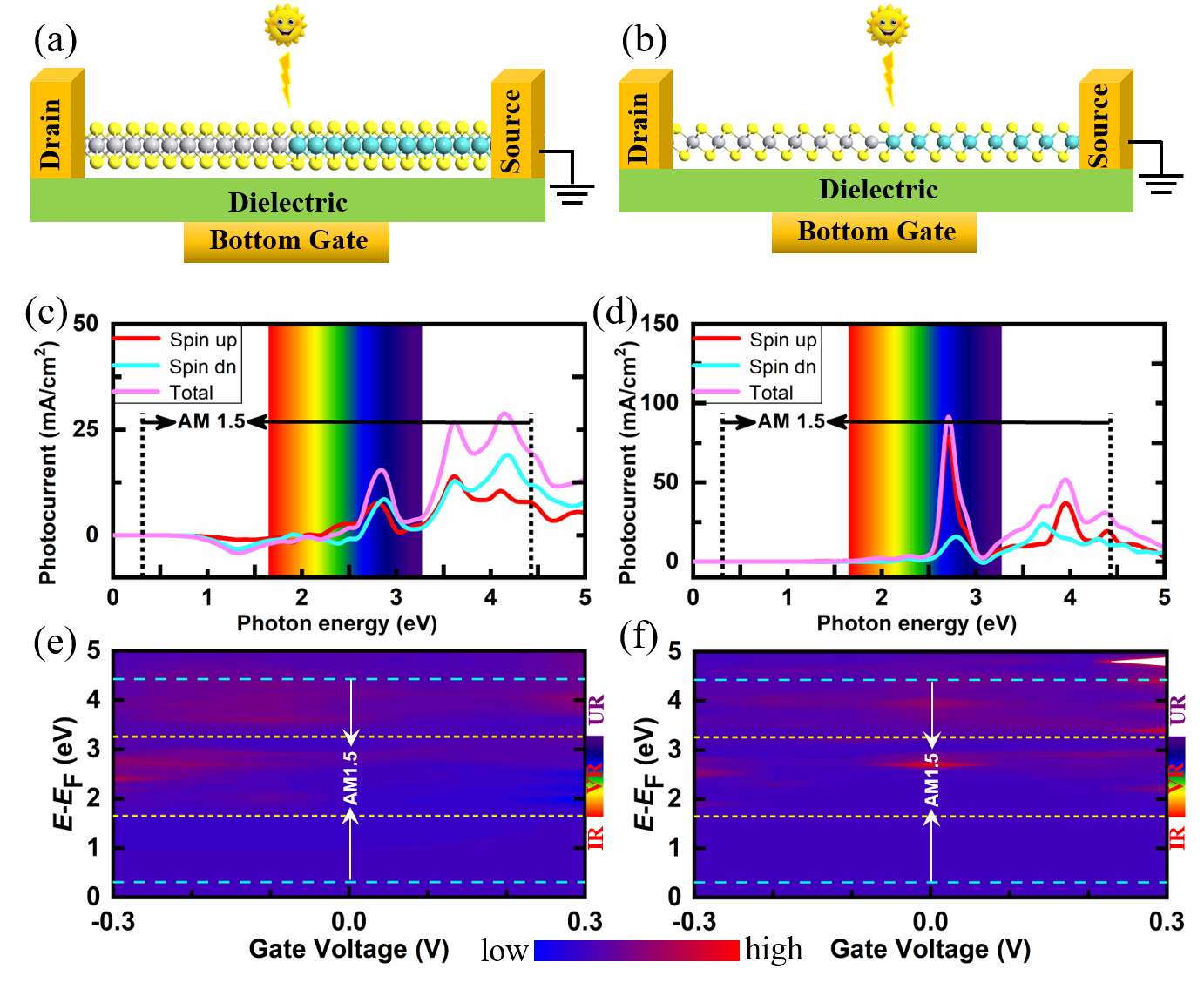 图5. VS2|MoS2 侧面异质光电晶体管。a) Z-type和 b) A-type VS2|MoS2 侧面异质结光电晶体管示意图。c) Z-type自旋相关光电流曲线,d) A-type自旋相关光电流曲线。栅极调控的e) Z-type和d) A-type光电流谱图。
