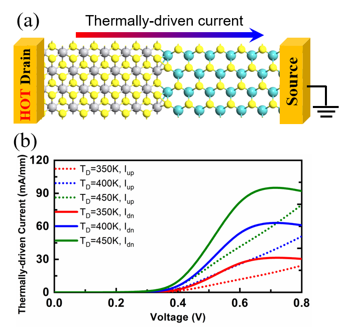 图6. Z-type VS2|MoS2 侧面异质结热电性质。Z-type VS2|MoS2 侧面异质结热电器件示意图a)和温度相关的热驱动电流曲线b)。