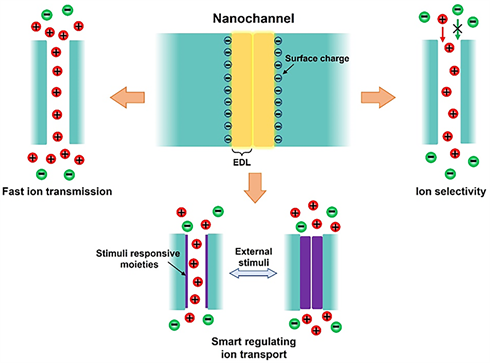 图1:纳米通道调控离子传输提升电化学能量储存与转换示意图