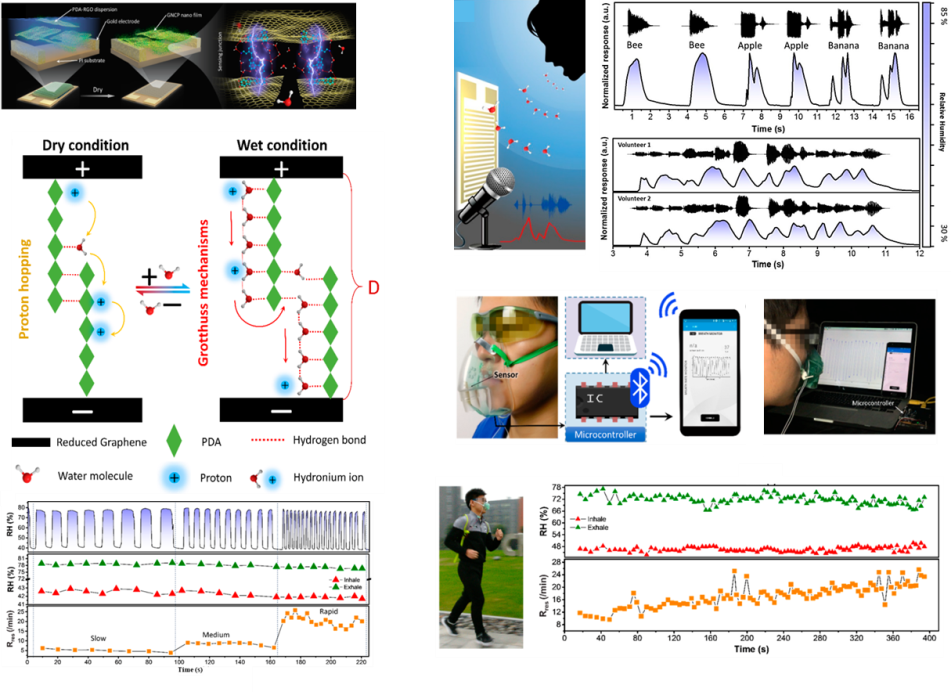 图3:聚多巴胺/石墨烯基湿度传感器用于呼吸行为多功能检测