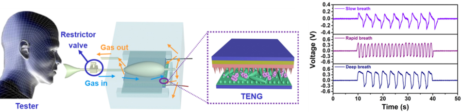 无创呼吸分析具有实现非植入式疾病诊断的巨大潜力,是一种极具吸引力的健康管理策略。一方面,基于湿度传感器的呼吸行为监测(频率,连续性等)可实现对睡眠呼吸暂停、哮喘、心脏骤停和肺癌等诸多疾病的无创诊断;另一方面,一些特定的人体呼出气体(如氨气、硫化氢、一氧化氮和丙酮等)可作为不同疾病(如肾脏疾病、口臭、哮喘和糖尿病等)的生物标记物。与其它呼吸成分检测技术相比,基于化学传感器的无创呼吸诊断具有小型化、低功耗、结构简单、成本低等优点,有利于实现便携式高效呼吸分析。虽然在过去二十年中,人们对呼吸气体/湿度传感器的敏感性能进行了广泛的研究,但在实现临床疾病诊断方面仍面临诸多挑战。鉴于此,开发基于集成式传感器阵列的电子鼻将成为提高检测精度的有效途径之一。此外,结合自供电技术的呼吸分析有望摆脱对外部电源的依赖,在无创疾病诊断领域展现出良好的发展前景。