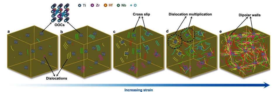 对高熵合金 TiZrHfNb 的研究发现,该合金添加氧元素之后,实现了强度和塑性的同时大幅度提高。通过高分辨电镜等的表征发现, TiZrHfNb 合金中存在(Ti,Zr)以及(Hf, Nb)两种短程有序结构区域。材料中添加 O 元素后,优先占据(Ti, Zr)短程结构的间隙位置,形成有序氧复合体(O, Ti, Zr)(大小约为 1-3nm,),从而造成固溶强化,提高材料的强度。 同时, 由于有序氧复合体的形成对位错起钉扎作用,在塑性变形的过程中诱导了位错的交滑移运动, 从而提高了位错形核以及增值速率,增大了位错的密度,最终导致塑性的提高。 该发现是一种全新的合金强韧化手段, 叫做“异常间隙强韧化”, 为合金体系提供了一种同时提高强度和塑性的新途径。