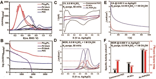 C,D)AL-Pt/Pt3Ga在C)0.5 M H2SO4溶液和D)0.5 M H2SO4 + 1 M甲醇溶液中与工业Pt/C和Pt NCs的CV曲线;