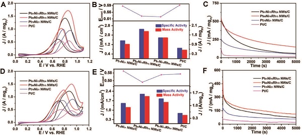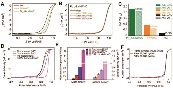 A)Pt4.31Ga NWs/C与工业Pt/C在0.1 M饱和HClO4溶液中的ORR极化曲线比较;