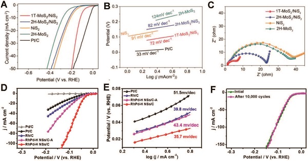 A)1T-MoS2/NiS2与2H-MoS2/NiS2、NiS2、2H-MoS2和商用Pt/C的极化曲线比较;
