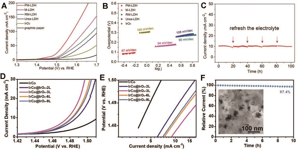 D,E)IrCo@IrOx-nL NDs的OER极化曲线和Tafel图;