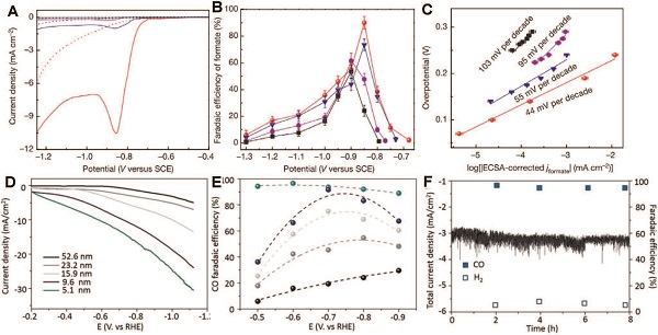 A)在饱和二氧化碳(实线)、0.1 M Na2SO4水溶液中的4原子层厚度的部分氧化的Co (红色)与4原子层厚度的Co (蓝色)、部分氧化的Co块 (紫色)和大块Co(黑色)的A)LSV曲线,B)甲酸盐效率,C)塔菲尔图;