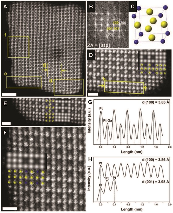 C)金属间化合物Pt3Ga的单元胞,Pt和Ga原子分别由黄色和蓝色球体表示;