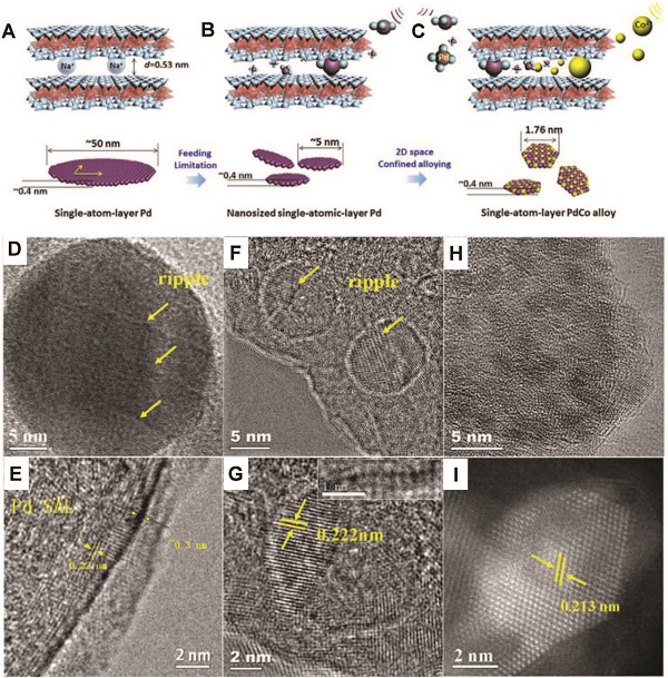E)Pd-SAL和G)Pd-n-SAL的侧视图图像显示一个原子厚度;