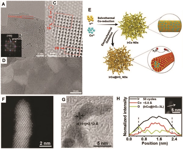 F,G)IrCo@IrOx NDs的F)HRTEM和G)AC-HAADF-STEM图;