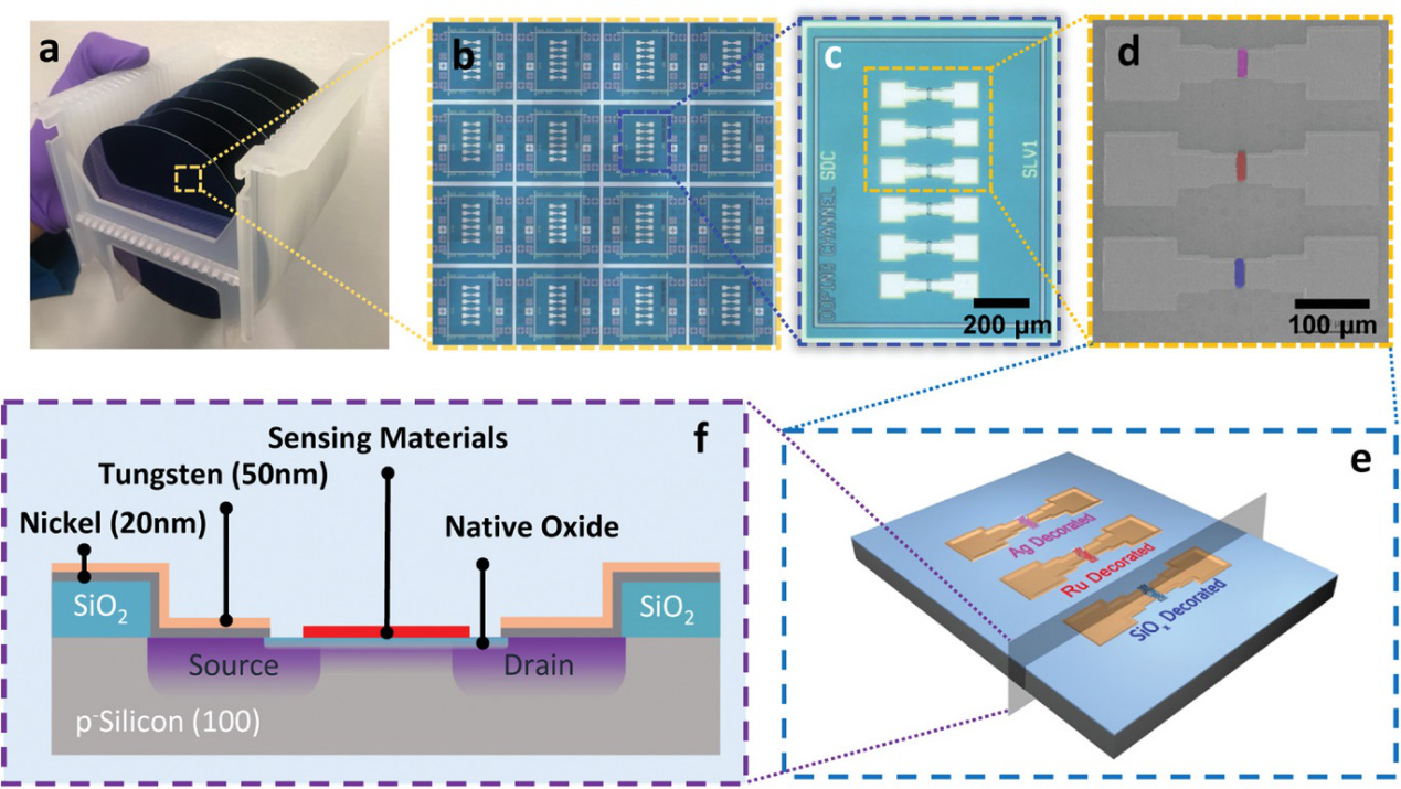 研究团队用设计并制备了具有高工艺兼容性、高敏感特性的的硅基气湿敏场效应管阵列,并针对应用场景设计了该阵列的敏感功能,实现了小尺寸、低功耗、高性能气体传感器阵列的晶圆级制备。结合后端电路与软件,构建了便携式气湿敏检测系统,实现了食物质量评估检测。该研究为气湿敏传感器的设计与制备提供了新思路,促进了气湿敏传感器的规模化生产与应用。