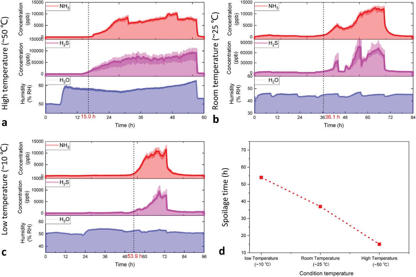 近日,加州大学伯克利分校的阿里·贾维教授(通讯作者)与袁震(第一作者)等人基于场效应管结构,利用传统硅工艺技术制备了场效应管阵列。该制备方法与现代芯片制造工艺完全兼容,可实现晶圆级制备。在该研究中,针对食物变质检测这一应用场景,采用不同敏感材料对各单元分别进行修饰,制备了能够同时监测氨气、硫化氢与湿度的气湿敏场效应管阵列。该器件显示出良好的灵敏度与极低的检测极限,具有良好的选择性,各单元间交叉串扰响应与基线漂移较小,展示出优异的气敏检测性能。此外,基于器件性能参数,该研究设计了包括便携式信号读取输出电路与显示软件在内的多组分气湿敏检测系统。并应用于高蛋白食物的质量评估检测中。相关成果以“Trace‐Level, Multi‐Gas Detection for Food Quality Assessment Based on Decorated Silicon Transistor Arrays”为题发表在国际著名期刊Adv. Mater.上。