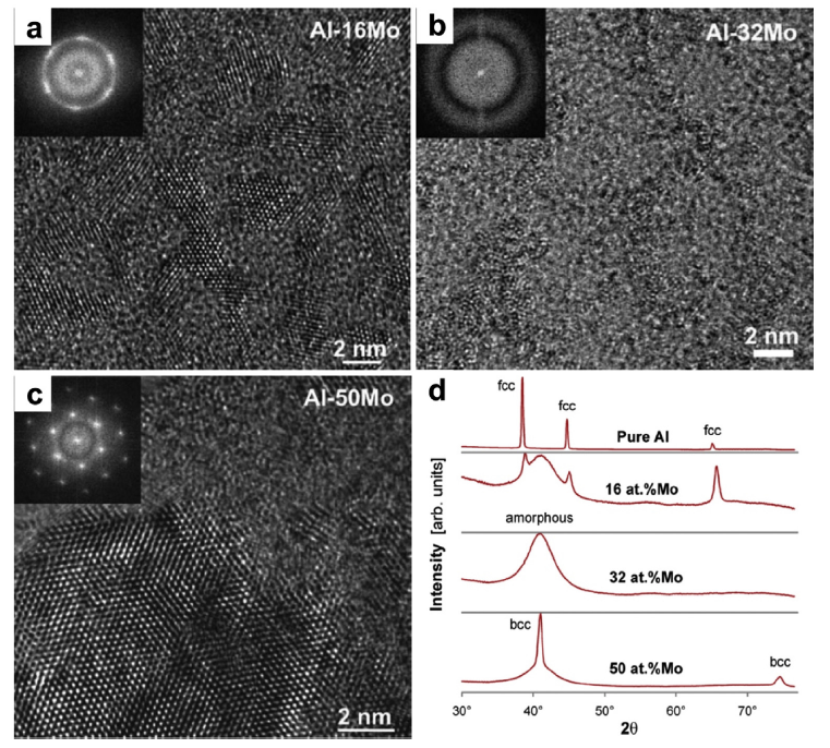 图10为不同Mo含量下Al-Mo合金的高分辨TEM和XRD图像,可以看出,随着Mo含量的增加(16~50 at.%),非晶态区域也不断扩大,在32 at.%时图像显示为整体非晶态组织,而当含量为50 at.%时又变成了bcc晶体结构[13]。