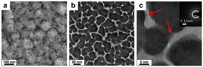 图11为典型的非晶态纳米结构,增加溅射功率和压力会促进原子的不均匀性,从而形成纳米玻璃,但延长溅射时间会导致晶粒发生粗化。除了靶材的化学成分和GFA(glass-forming ability),Chen等人发现靶材的制造工艺也会影响纳米玻璃的形成[14,15]。