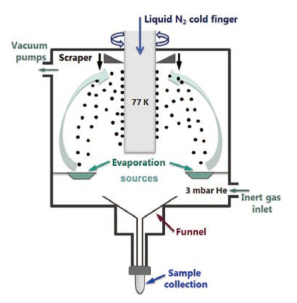 在过去的几年间已经开发了多种从单片非晶合金中形成纳米非晶合金的方法,例如,惰性气体冷凝法(inert gas condensation,IGC)、炉内(Furnace)或闪蒸(Flash)退火、剧烈塑性变形(severe plastic deformation,SPD)、电子/离子/脉冲激光辐照和超声振动等。IGC方法的原理如图3所示,在惰性气体环境中加热母合金至熔融态,蒸发出的原子与惰性气体分子碰撞后凝聚成纳米尺度的非晶颗粒,并在热对流的作用下沉积到液氮冷却柱上,随后通过一个刮板将颗粒刮落收集后进行原位高压成形。采用该方法已经成功制备的合金由Au-Si、Au-La、Fe-Si、Fe-Sc、La-Si、Pd-Si、Ni-Ti、Ni-Zr、Ti-P等。