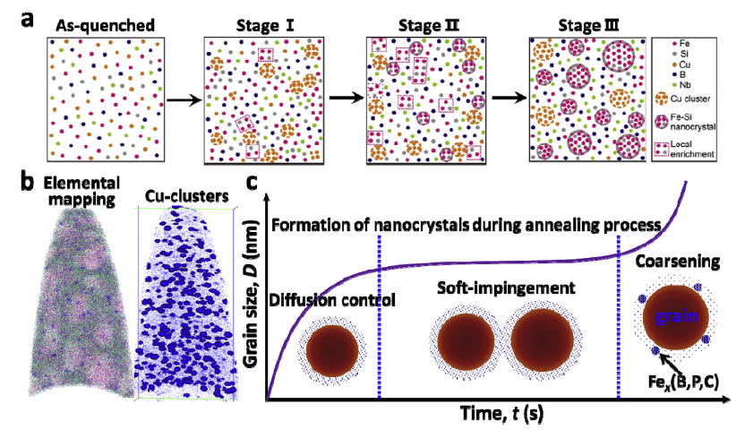 某些Fe基非晶合金,尤其是可以用来制作纳米晶体的软磁合金,也可以用来制造非晶纳米合金,在该类合金中,通常需要以Cu为中心的团簇作为形成初级bcc-Fe基纳米晶体的催化点位。Hono等人首先使用3DAPT在FINEMENT(FeSiBNbCu)合金中形成了纳米晶体,他们研究发现在结晶之前首先要形成高密度的Cu团簇(1024m-3),以此作为初次结晶的异质形核的点位。