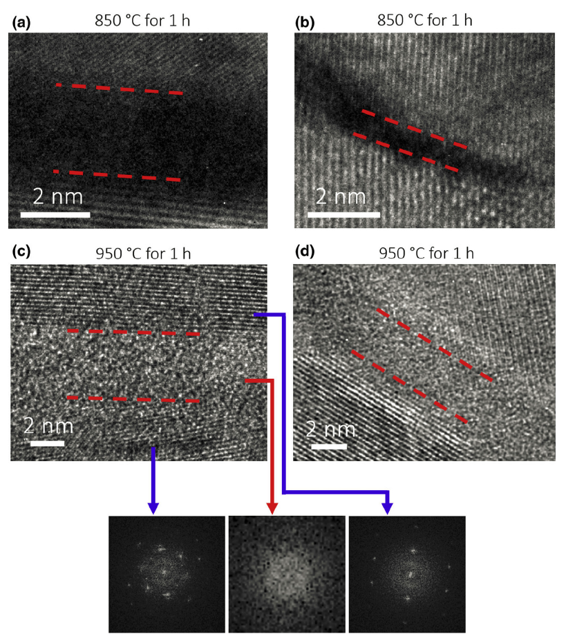 图8 Cu-Zr试样中检测到的晶间非晶层的高分辨TEM图像[12]:(a)2.6nm,(b)0.8nm,(c)4.1nm,(d)2.9nm