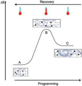 图1.热响应形状记忆聚合物的永久和临时形状的势能图。(A显示了熵有利的永久形状,可以通过加热和变形将其编程为不利的临时状态C。 永久形状A可以通过加热临时形状C来恢复。 在暂时形状和永久形状之间切换期间,聚合物经历过渡态B,其中聚合物链具有可移动性,从而允许链的重组)