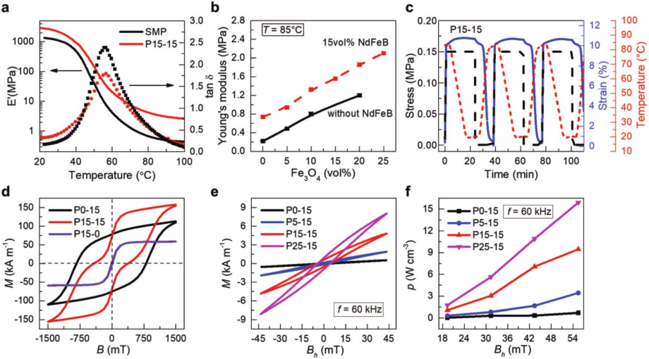 图10. M-SMP的热机械性能和磁加热特性。a)纯SMP和P15-15(含15%(体积)Fe3O4和15%(体积)NdFeB的M-SMP)的储能模量和tanδ与温度的关系;b)在85°C下,NdFeB和Fe3O4颗粒负载量对M-SMP的杨氏模量的影响;c)在第2到第4周期中,P15-15的形状记忆性能(黑色虚线:应力;蓝色实线:应变;红色虚线:温度);d)M-SMP的静态磁滞回线。M是在施加的磁场B下测得的磁矩密度e)在60 kHz交流磁场下,具有不同Fe3O4负载(P0-15,P5-15,P15-15和P25-15)的M-SMP的磁滞回线;f)电磁加热功率。不同Bh下不同Fe3O4含量的M-SMP的密度。