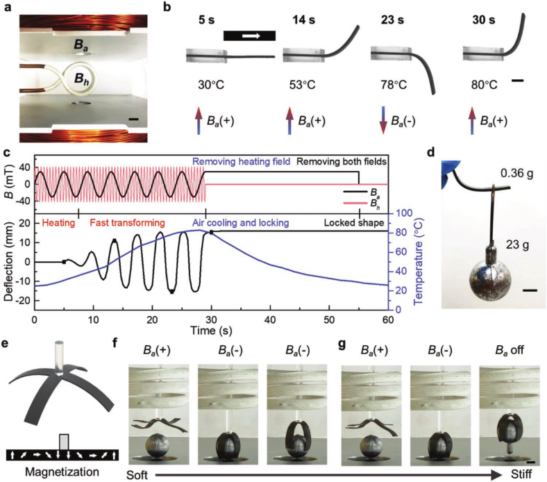 图11. M-SMP通过叠加磁场的快速变形和形状锁定。a)叠加磁场的实验装置:一对电磁线圈产生致动磁场Ba;中间的螺线管产生加热磁场Bh;b)悬臂弯曲和形状锁定;c)Ba和Bh的磁场分布以及束偏转和温度相对于时间的关系;d)锁定的弯曲梁,其重量(23 g)比其重量(0.36 g)重64倍;e)四臂M-SMP抓手(0.47 g)的设计和磁化曲线;f,g)M-SMP夹具在没有(f)和具有(g)形状锁定的情况下提起铅球(23 g);