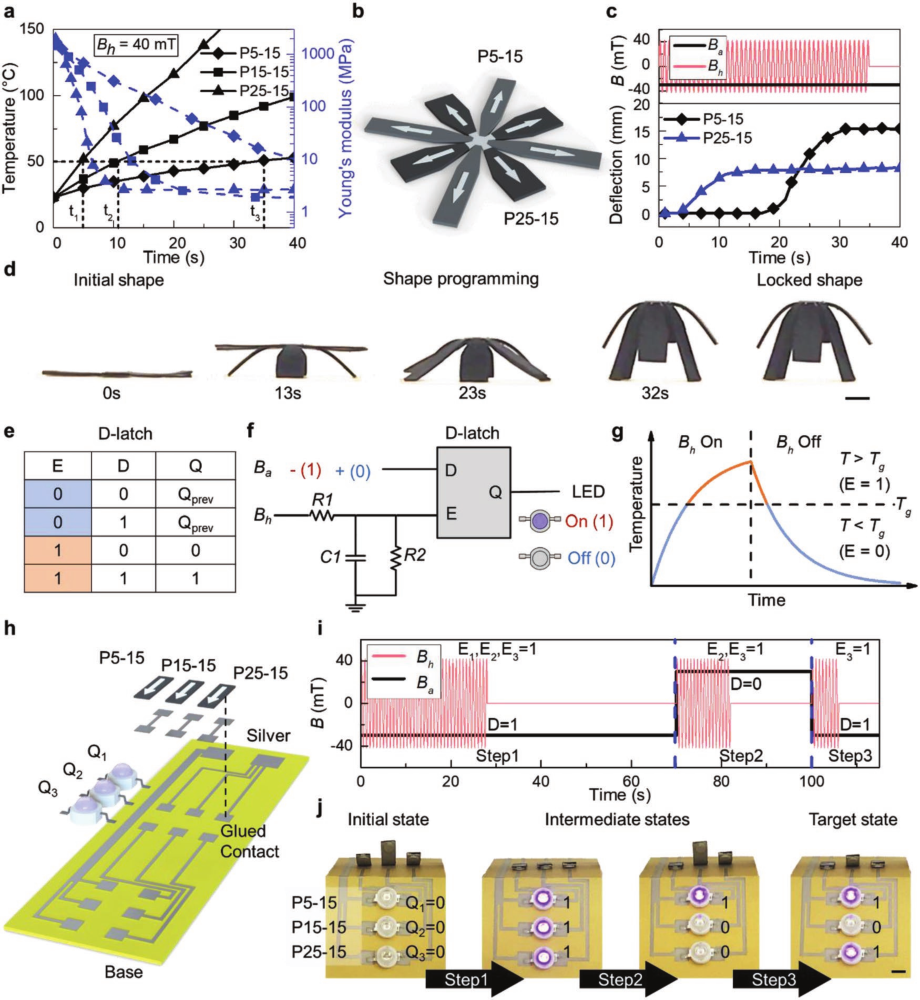 图12. M-SMP的顺序驱动及其在数字逻辑电路中的应用。a)三种含有不同Fe3O4负载的M-SMP的温度和相应的杨氏模量;b)使用P5-15和P25-15设计并磁化花朵状结构;c)磁场分布(Ba和Bh)以及顺序驱动的M-SMP随时间的偏转;d)顺序形状转换和形状锁定;e)D锁的真值表;f)M-SMP D锁存逻辑的示意图,其中两个磁场(Ba和Bh)用作输入,LED状态作为输出;g)Bh与D锁存器的启用输入E之间的关系;h)使用具有不同Fe3O4负载(P5-15,P15-15和P25-15)的M-SMP设计时序逻辑电路;i)具有三个步骤和输出的顺序逻辑电路的磁控制;j)四个不同输出状态的LED指示。(d)和(j)中的比例尺:5毫米。
