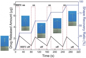 图2.使用HIFU同时触发形状记忆聚合物的回收和硫酸铜药物从聚合物基质中的释放