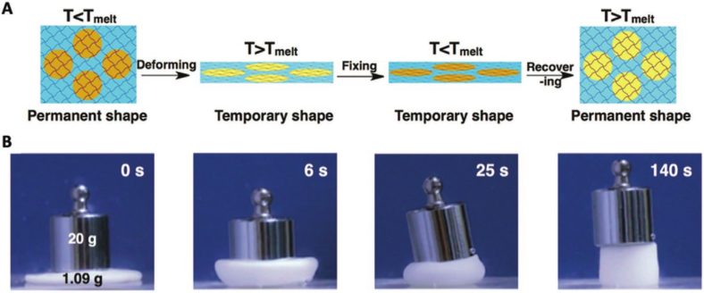 图5.具有高应变能力的形状记忆两亲有机凝胶网络。A)对临时形状进行编程并恢复永久形状的过程;B)在数倍于其自重的负载下恢复形状记忆聚合物的永久形状。